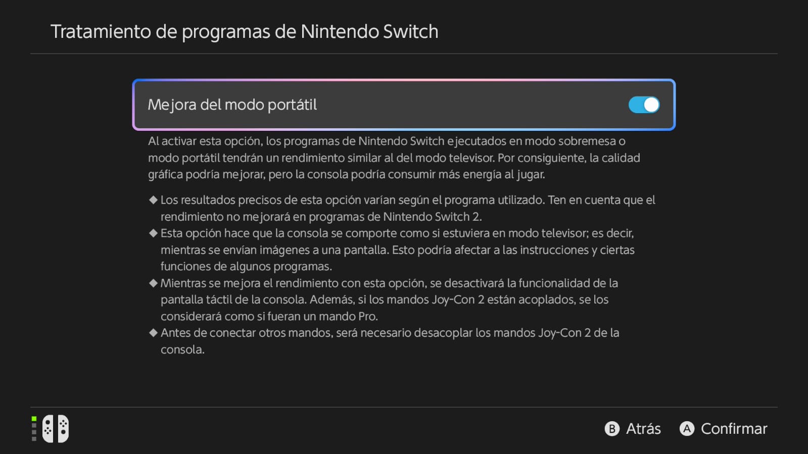 Nota importante: Al activar esta función, la consola consumirá un poco más de batería debido al aumento de procesamiento gráfico, similar al consumo que tiene un juego nativo de Switch 2.