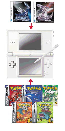 | En la transición entre los juegos Oro y Plata y Rubí y Zafiro, muchos entrenadores estuvieron decepcionados y ultrajados por la falta de capacidad de transferir sus Pokémon. Sin embargo en Diamante y Perla, han rectificado esto y han permitido transferir tus Pokémon de Rubí, Zafiro, Esmeralda, RojoFuego o VerdeHoja al Diamante y Perla. Aunque la Nintendo DS no puede conectarse físicamente al GBA, tu tienes que hacerlo de una manera diferente. Primero necesitas tener el juego de GBA y ponerlo en la ranura de GBA en el Nintendo DS y el Diamante y Perla en la ranura de juegos DS. Entonces cuando cargas tu DS, selecciona Diamante o Perla. |