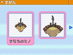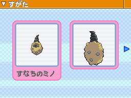 La siguiente fomra de Burmy es Tierra Amarilla. Esta forma se obtiene después de combatir en cuevas, ruinas o en los caminos