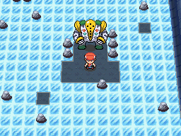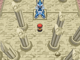 Por medio de este evento, recibirás un objeto llamado: Flauta Azure (Azure flute). Con este objeto en tu mochila, ve a la Columna Lanza (Spear Pilar) en Mt. Corona (Mt. Coronet) dónde tu luchaste contra Dialga o Palkia. Ve al símbolo entre los pilares y usa la Flauta Azure (Azure flute). Algunas escaleras aparecerán para que subas a la Sala del Origen (Hall of Origin). Aquí Arceus reside. Estate alerta, es nivel muy alto Pokémon Salvaje a Nv. 80 así que preparate.