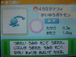 Manaphy, el Príncipe del Mar, se obtiene vía un Evento Especial que estaba disponible para Pokémon Ranger. Puedes transferir a Manaphy a tu juego. El Huevo se abre después de un rato en Nv. 1 Manaphy. Sin embargo a Manaphy lo puedes usar para criar y cuando haces la crianza, saldrá del Huevo un Pseudo-Manaphy; Phione. Una versión más Débil de Manaphy