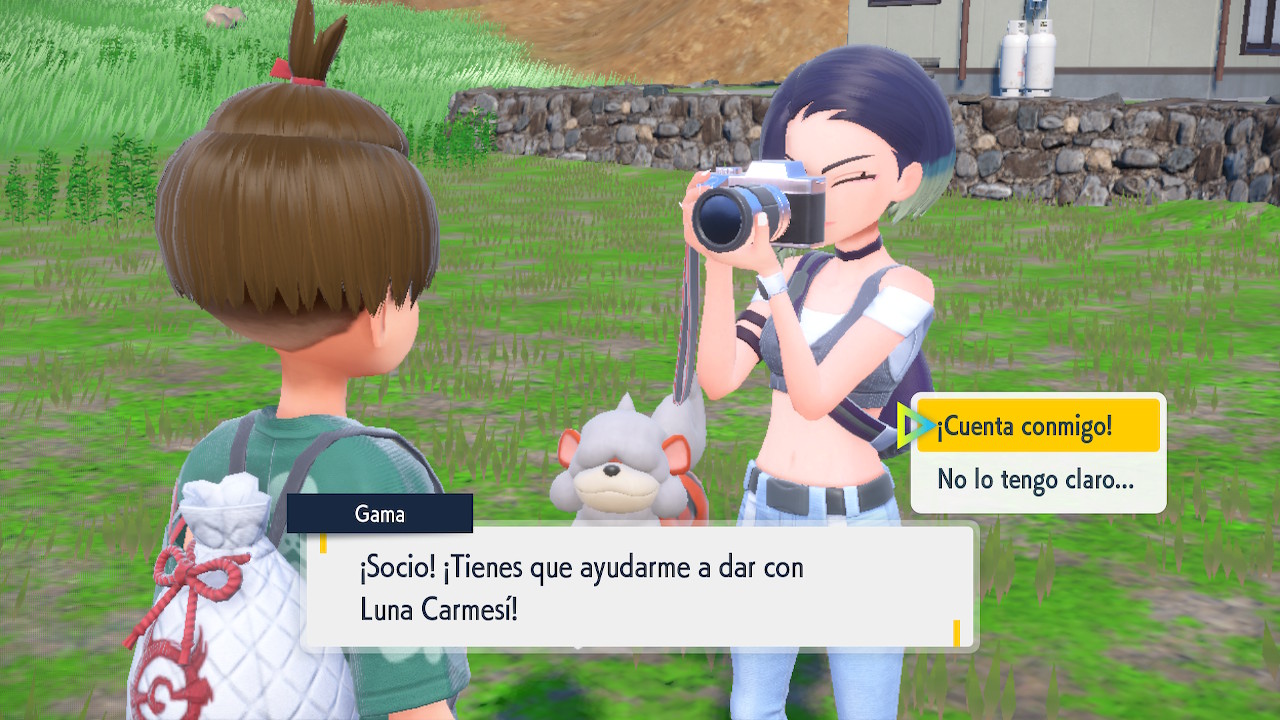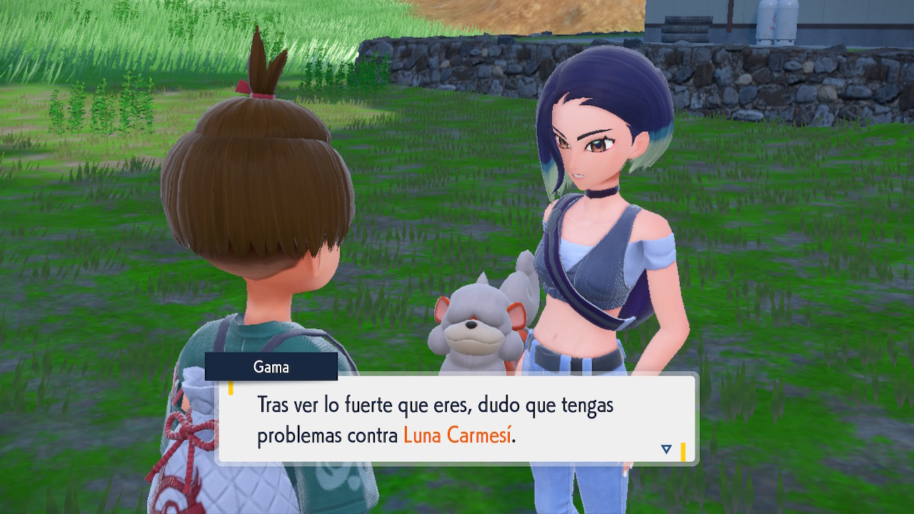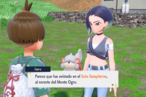 Cuando hayas capturado y registrado 150 Pokémon en la Pokédex de Noroteo, habla con Gema y te pedirá ayuda para tomarle una fotografía a Ursaluna Luna Carmesí. Sin embargo, primero probará tu fuerza en un combate Pokémon.