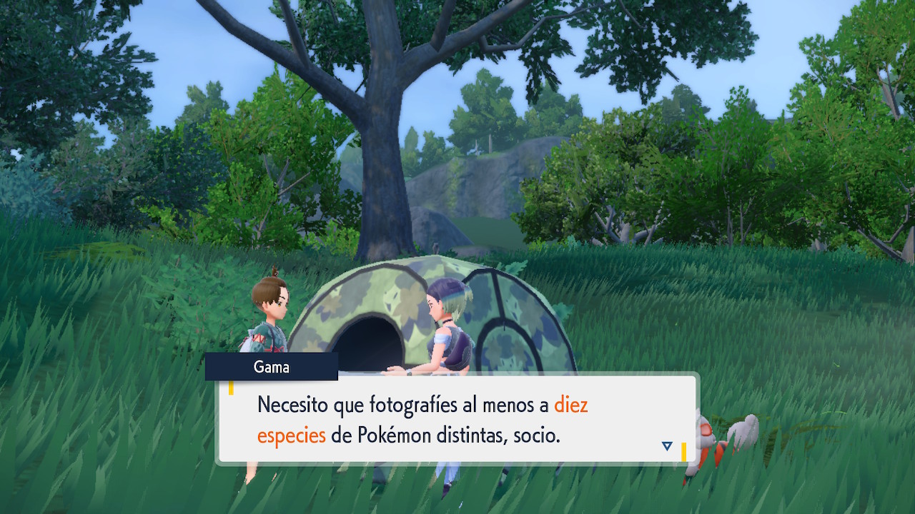 Después de salvar a Gama, montarán una base con una carpa. Te pedirá que la ayudes a hacer la investigación tomando 10 fotografías de 10 especies diferentes de Pokémon. Habla con ella para comenzar la investigación cuando estés listo.