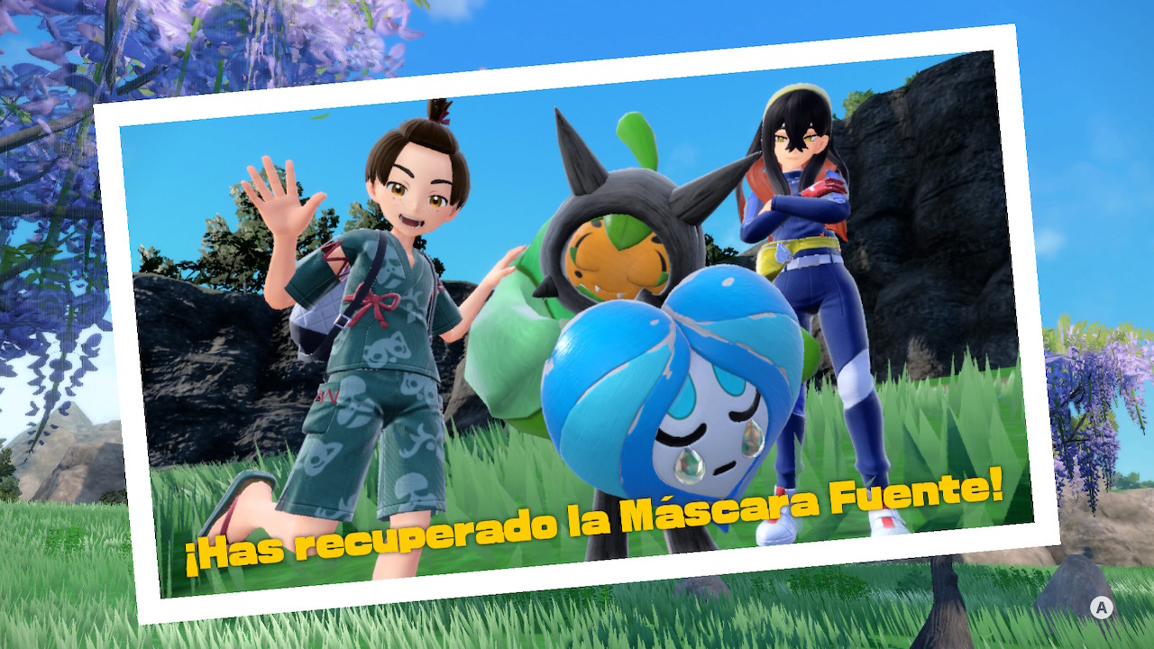 Ve a Villa Versui usando un taxi volador. Verás una secuencia donde no podrás hacer ninguna acción, solo ver cómo los aldeanos le piden disculpas a Ogerpon y le dicen que puede quedarse con sus máscaras recuperadas.