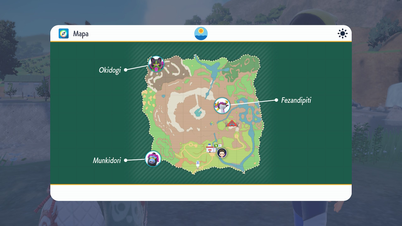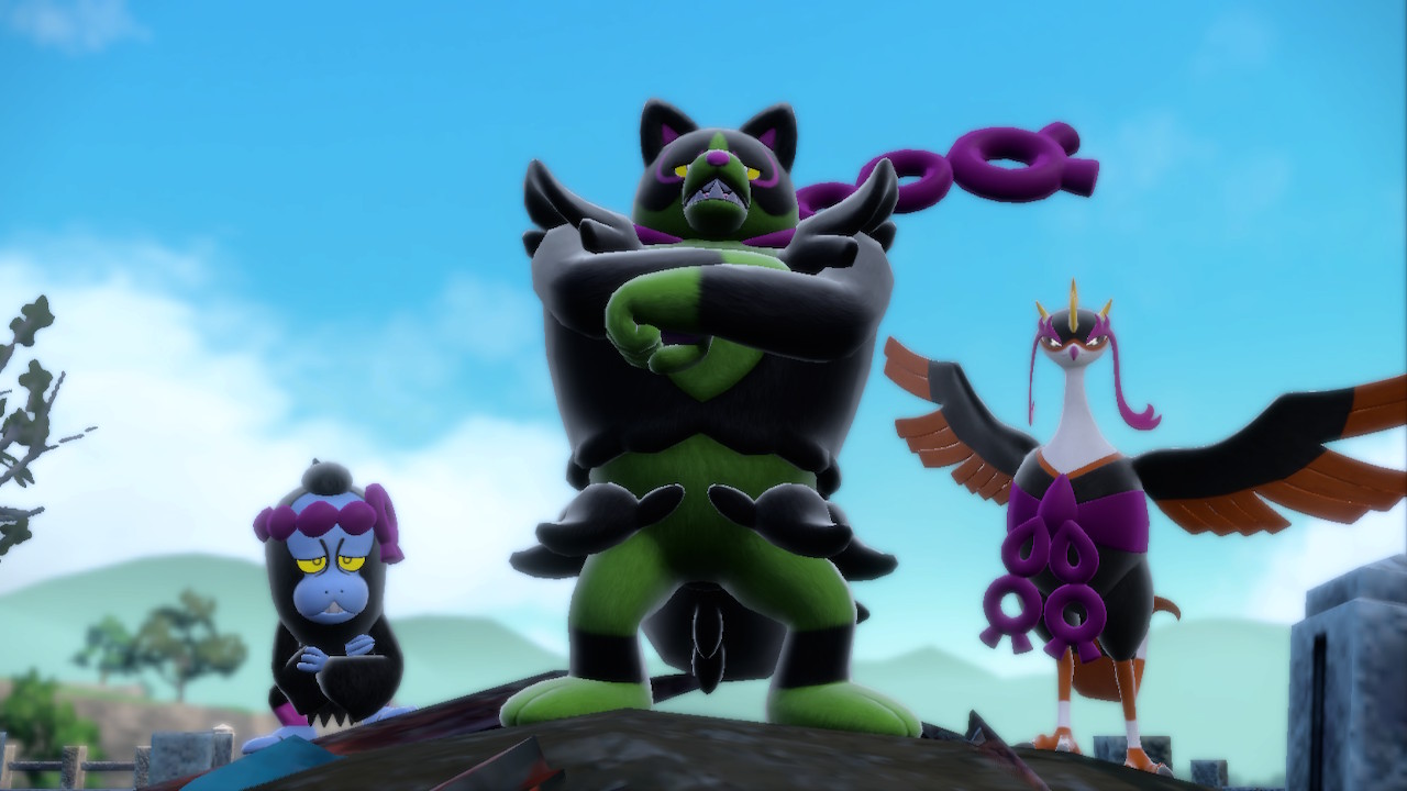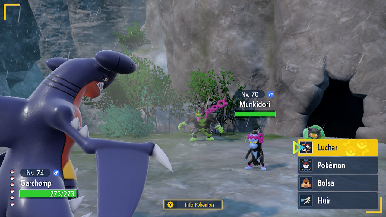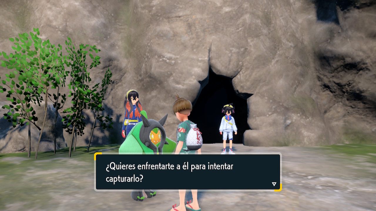 Ve hasta Monte Ogro para llegar a la morada de Ogerpon en la Gruta del Pavor. En la puerta de la cueva te encontrarás a Los compatrones, Okidogi, Munkidori y Fezandipiti molestando a un Ogerpon tirado en el suelo, todo indefenso. Uno de ellos te hará frente en un combate.