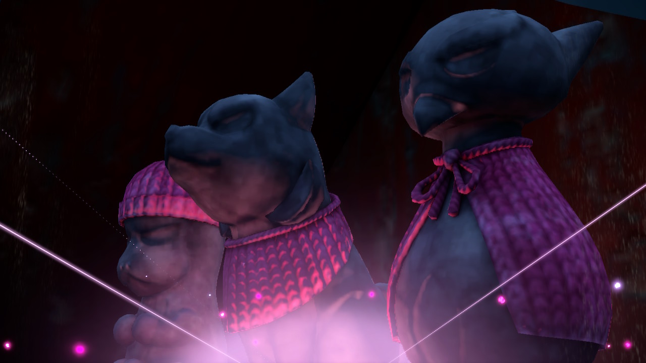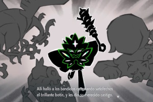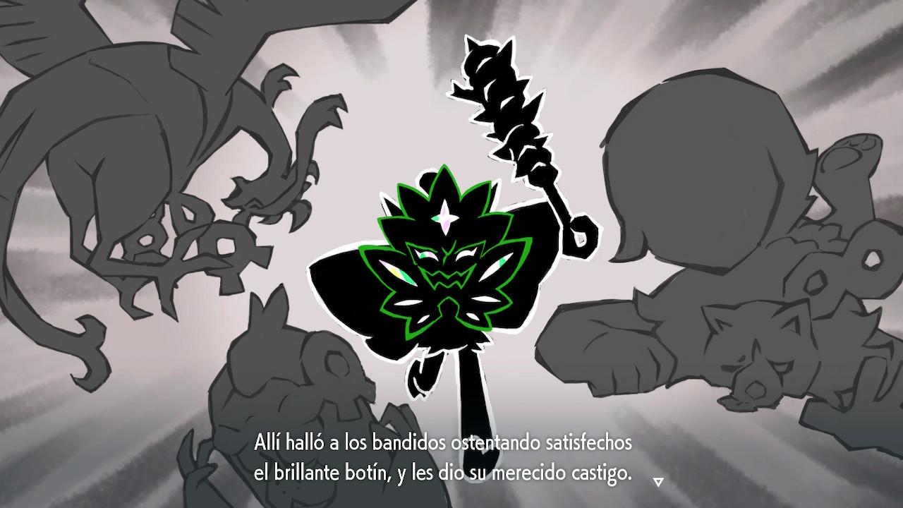 Y así fue, en efecto, como terminó por atraer a la comarca a un grupo de codiciosos Pokémon. Aquellos rufianes entraron a hurtadillas en el hogar de los viajeros… Con la intención de hurtar las máscaras que con tanto celo allí guardaban. Quiso el azar que el hombre se hallara allí en ese instante, y con valor se enfrentó a los bandidos. Logró a duras penas salvar una de las máscaras, más no evitar que se llevaran las tres restantes.
