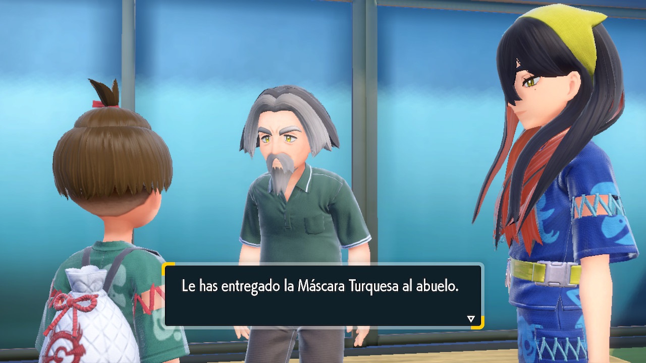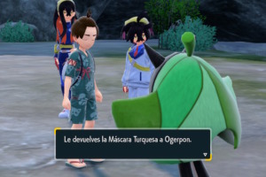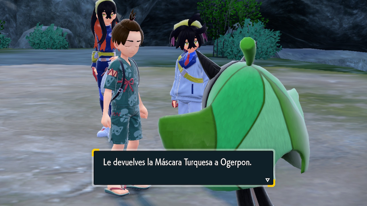 Al ganarle aparecerán Cass y Corin para ayudarte. Sin embargo el trío de Los compatrones huirá del lugar. Le entregarás la Máscara Turquesa a Ogerpon y este desde ahora te seguirá a donde vayas.