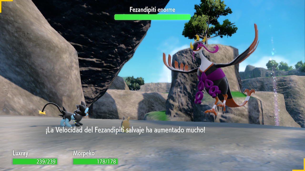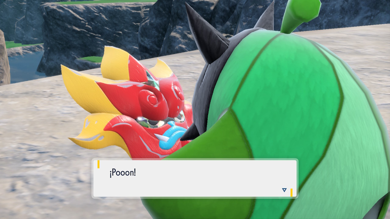 Ahora podrás medir tu fuerza contra Ogerpon. Ten en cuenta que deberás vencerlo cuatro veces seguidas, ya que este utilizará todas sus máscaras en el combate y, en consecuencia, su segundo tipo. Interactúa con él para iniciar el combate.