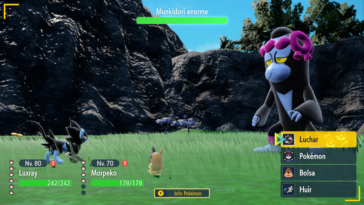Munkidori enorme estará esperándote para que por fin consigas la última máscara. Corin volverá a asistirte en el combate con su equipo de Pokémon. Además, Ogerpon también te ayudarásubiendo algunas de las estadísticas de tus Pokémon en algún momento del combate.