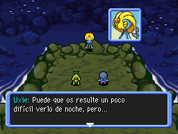 Uxie os escoltara al Lago Velado, tú compañero dirá que es difícil ver con la oscuridad de la noche, entonces Uxie os mostrara el Lago Velado. Verás un lago con una luz en el centro y varias luces alrededor del lago. Tú compañero no se imaginaba un lago sobre la esta meseta. Luego os dirá que miren al centro del lago. Verás un resplandor verdoso, entonces Uxie dirá que se acerquen más y verán el engranaje del tiempo. Ustedes se sorprenderán al no saber como era uno. Uxie te dirá que el es el guardián del engranaje del tiempo.