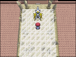 El método para obtener Arceus es idéntico al de Diamante y Perla. Si has recibido la Flauta Azul (Azure Flute) de un evento de Nintendo, has tu camino hasta Columna Lanza (Spear Pillar). Una vez allí, te preguntará si deseas tocar la flauta. Si seleccionas Sí, empezará a sonar y una gran escalera aparecerá. Sube y en la parte superior estará Arceus descansando, mirando hacia abajo a la Región de Sinnoh. Ve hasta él y te luchará. Estate preparado ya que el está en Nivel 80, es el más alto de los Pokémon salvajes.
