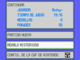 Una vez hecho esto, guarda la partida y reinicia la consola Nintendo DS. Si lo haz hecho bien, aparecerá en el menú principal una opción extra llamada Regalo Misterioso (Mystery Gift) antes de cargar nuestra partida.