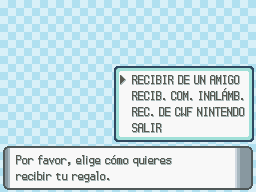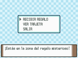 Ahora, en el menú principal, aparecerá la opción Regalo Misterioso (Mystery Gift), en primer lugar sólo hay una opción, dos si hemos recibido una Wonder Card.
