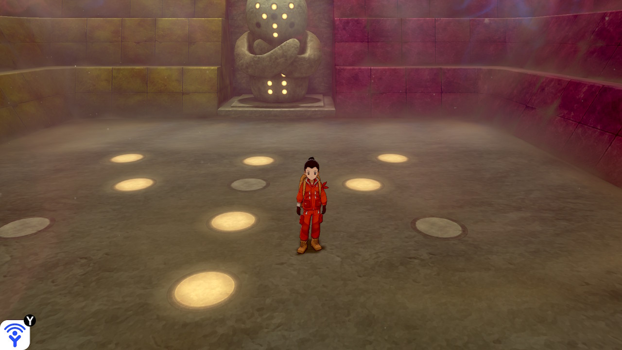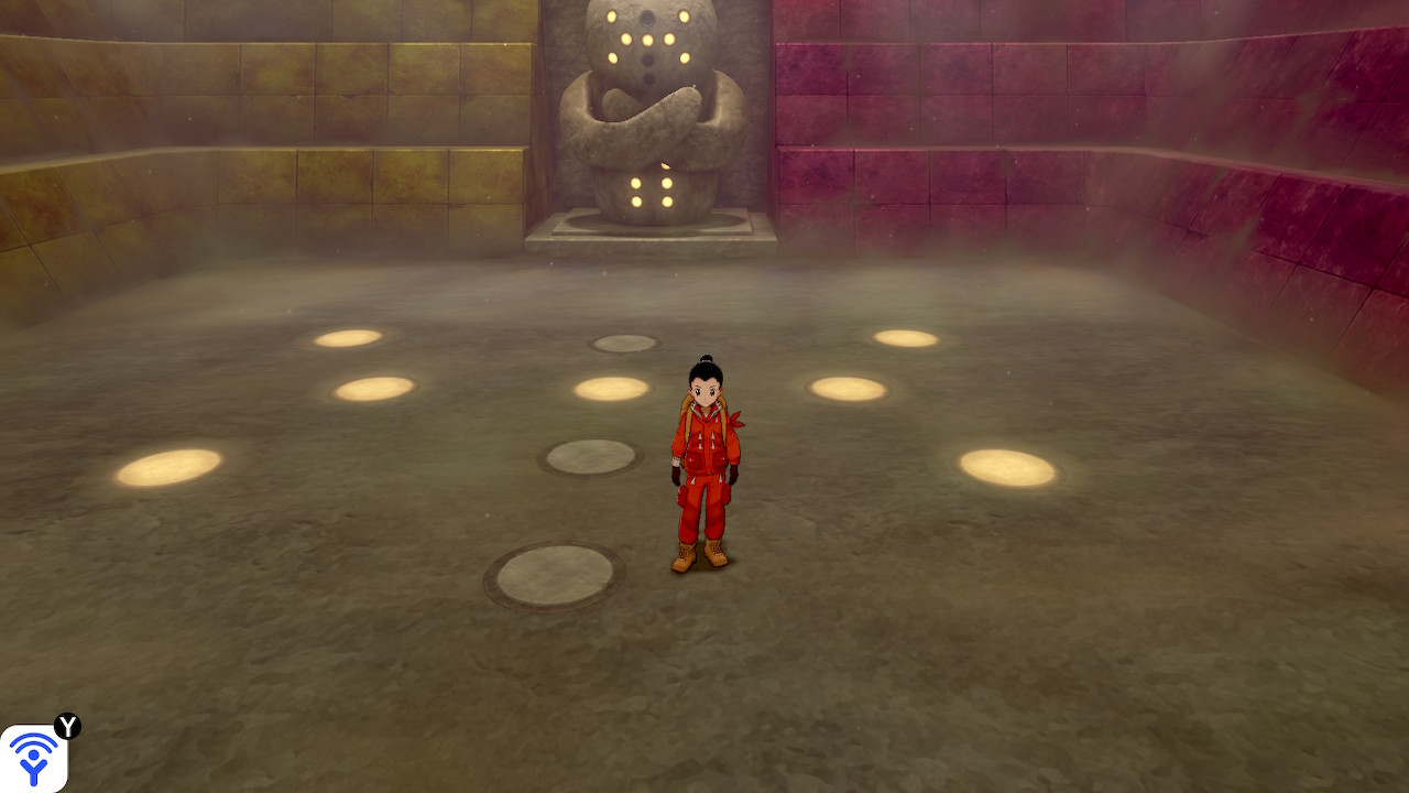 El siguiente paso es pisar todos los paneles circulares del suelo para que enciendan su luz. Una vez que hayas encendido todas las luces podrás interactuar con la estatua y enfrentarte a Registeel.