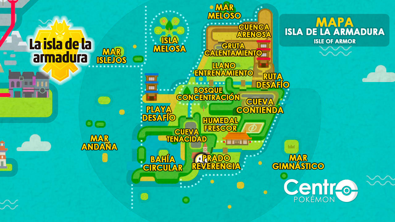 La Isla de la Armadura es la primera expansión de Pokémon Espada y Escudo. Se trata de una isla que extiende a la región de Galar con una nueva historia por conocer y con más Pokémon para atrapar. Este es el mapa: