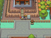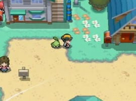 Personaje principal caminando por Pueblo Primavera (New Bark Town) con su Chikorita