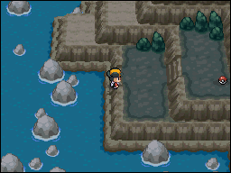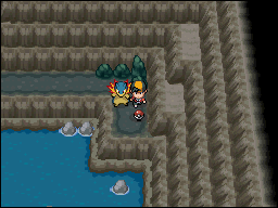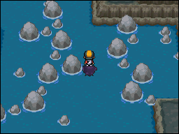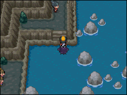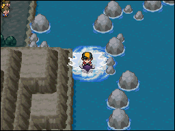 Haz SURF y ve hacia la izquierda, llegarás a tierra firme donde una ENTRENADORA GUAY te retará. Si tocas la roca que está a la izquierda, encontrarás una MÁX. POCIÓN (Max Potion). Surfea hacia la izquierda y enfréntate a las gemelas para luego conseguir un ELIXIR MÁX (Max Elixir).