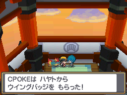 Cuando ganes, Pegaso (Falker) te entregará la Medalla Céfiro (Zephyr Badge) que mejora el ataque de los Pokémon y la MT 51 RESPIRO (Roost). Ahora serás capaz de utilizar la MT 70 DESTELLO (Flash) fuera de combate y todos los Pokémon hasta Nivel 20 te obedecerán.