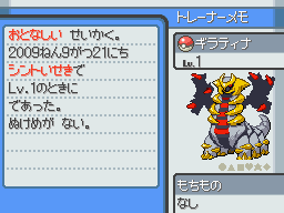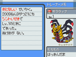 Una nueva forma para Giratina apareció por primera vez en Pokémon Platino, se trataba de la forma que este adapta en su mundo: La Forma Origen. Fuera de él hasta entonces era imposible que estuviera en esa forma, pero gracias al objeto Griseosfera (Griseous Orb) esto se hizo posible. El Giratina que puedes obtener del Evento de Arceus en las Ruinas Shinto (Shinto Ruins) vendrá equipado con esta piedra, así que no tendrás que preocuparte por el cambio, sólo necesitas removerle la Griseosfera cuando quieras y se transformará en su Forma Modificada.