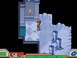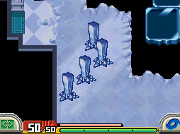 Vuelve a la sala con el piso congelado y lánzate por los lados. Llegarás al principio donde luchaste con los malos. Derrite el hielo enorme con ayuda del Movimiento de Campo Quemar Nivel 4 de Ninetales y avanza. Verás una maquina de guardado, aprovéchala. Sube las escaleras, continua el camino y llegarás a otro salón congelado. Ve hacia adelante y verás unas plataformas, tendrás que ir hacia la derecha. Apresúrate ya que se rompen, primero súbete a los bloques de la derecha y luego ve en esa misma dirección hasta llegar a la puerta. Avanza hasta llegar a otro salón con el suelo resbaladizo. Captura un Vulpix y sal por la puerta izquierda.