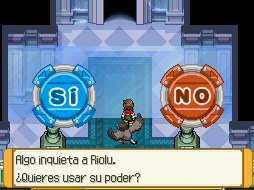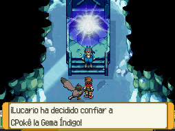 Sal de allí. De nuevo en la habitación resbaladiza, dirígete a la puerta de la derecha, captura al Riolu y Vuelve a la habitación donde peleaste con el Froslass, acércate a la barrera de luz y te dirá si quieres usar el poder de Riolu. La barrera desaparecerá y avanza. Llegarás a una máquina de guardado, aprovecha. Recibirás un correo de Ritmi/Rhythmi diciendo que adelante hay un Pokémon muy poderoso. Avanza al siguiente salón. Verás una piedra brillante. De la nada, sale un Lucario, guardián de la piedra, que luego de dar vueltas alrededor de ti, te atacará