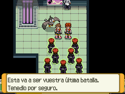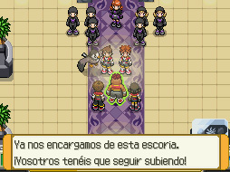 Sube por las escaleras. Llegarás a una nueva zona y verás una gran escalera, sube por ella. Una vez hecho esto, avanza por la izquierda y un recluta te atacará con tres Gabite. Continua por la escalera de la izquierda, y te encontrarás con otras reclutas, que esta vez llaman a dos Gengar. Ve por la derecha y sube nuevamente otras escaleras. Sigue por la izquierda y otra vez las escaleras. Continúa por la derecha y verás otro miembro, que te ataca con un Mamoswine.