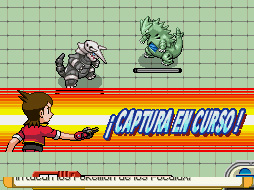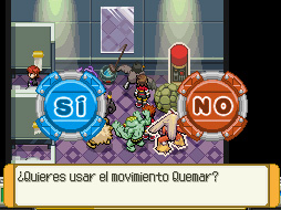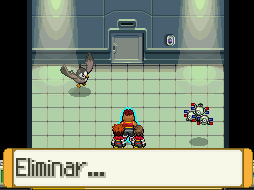 Vuelve a la sala donde estaba el recluta escondido (antes captura al Magneton del pasillo para recargarte) y usa el Movimiento de Campo Quemar nivel 3 de Blaziken con el detector de humos. Comenzará a llover debido a que activaste el detector. El recluta saldrá y te atacará con un Aggron y un Tyranitar.