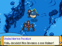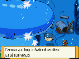 Te subirá a su lancha y emprenderás el viaje. En la mitad, saldrán unos chorros de agua. Te lanzarás al agua para investigar. Al bajar, podrás guardar tu partida. Avanza por el único camino posible y te encontrarás con un Wailord gigante que ha sido capturado por unas máquinas. Aquí comenzarás tu misión. Necesitarás el Movimiento de campo Destruir Nivel 3 para eliminarlas. Vuelve hacia atrás y captura un Huntail. Regresa con Wailord y usa a Huntail con su Movimiento de campo Destruir Nivel 3 sobre la máquina. Ahora podrás avanzar. Del tubo saldrá un Pocalux/Dim Sun que al verte te atacará con dos Horsea y un Seadra.