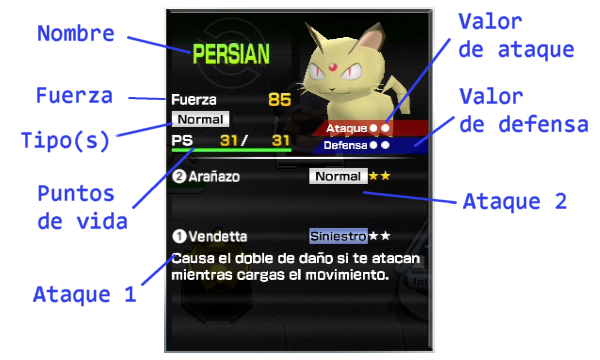 Los muñecos Pokémon tienen distintos valores, como fuerza, puntos de salud, ataque 1, ataque 2 y puntos de ataque y defensa (mínimo 1, máximo 5).