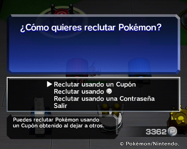 Cuando dejas varios Pokémon, según los que dejes, además de conseguir dinero, puedes obtener un cupón. Canjea ese cupón con esta opción. Tendrás más información enEvoluciones (Cupones Pokémon) y en Cupones Especiales.