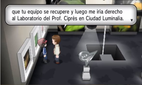 Luego de haber derrotado a la Líder nos vamos por la puerta de atrás de la carpa y saldremos a donde está el señor de la entrada del gimnasio. Este nos dirá que vayamos a curar a nuestros Pokémon y luego vayamos al Laboratorio del Prof. Ciprés en Ciudad Luminalia.
