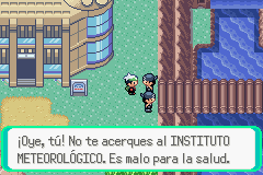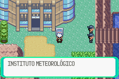 Cuando llegues al Instituto Meteorológico/Weather Institute entra en él. No podrás avanzar más por ahora por que el puente estará bloqueado por dos miembros del Equipo Magma o Aqua (depende de la versión).