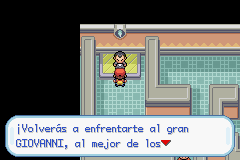 Ve al gimnasio. Verás que éste gimnasio está lleno de flechas direccionales en el piso como las que había en la Guarida Rocket. Ve por la izquierda para vencer al entrenador y luego arriba para vencer a otros entrenadores. Avanza y en parte central verás más batallas opcionales. La única batalla obligatoria es con el entrenador que está más al norte (esto es para que se quite del camino superior y luego puedas pasar). Regresa a la entrada y ve por el lado derecho, específicamente por la flecha que apunta hacia arriba. Sigue el camino que ya debe estar libre para poder llegar con el Líder de éste gimnasio. Te lo esperabas es Giovanni, sí el Jefe del Equipo Rocket, es el mismo líder de éste gimnasio.