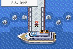 El S.S. Anne es un crucero de lujo para entrenadores POKéMON que visita Ciudad Carmín/Vermilion City una vez al año. Éste lugar ésta repleto de entrenadores POKéMON, así que visita cada cuarto y derrota a los entrenadores que encuentres, primero ve a la derecha y ve a abajo y baja las escaleras, inspecciona la basura para conseguir una Hiperpoción/Hyper Potion, entra en los cuartos y derrota a los entrenadores dentro, en éstos cuartos encontrarás un Éter y la MT44 Descanso/Rest. Ahora sube las escaleras y avanza a la izquierda entrando de cuarto en cuarto y derrotando a los entrenadores que te encuentres, en uno habrá una chica que te permitirá descansar (haz de cuenta que es un Centro POKéMON).