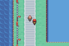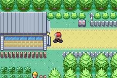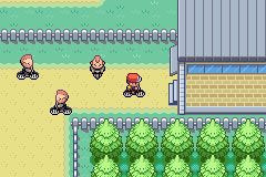 Avanza a la izquierda, hay tres Ornitólogo/Bird Keepers en un rincón de hierba al sur, entra en el edificio. Sube las escaleras para encontrar a un tipo que te cambia su Lickitung por tu Golduck(Rojo Fuego) ó por tu Slowbro(Verde Hoja). Sal del edificio e inmediatamente aparecerás en tu Bicicleta, porque estarás en el Camino de las Bicis y por obligación tienes que usar la bicicleta. Avanza a la izquierda y sube para llegar a la Ruta/Route 17.