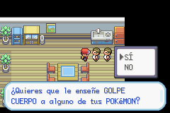 En la casa a la derecha de la Guardería está un tipo que le enseñará a alguno de tus Pokémons el movimiento Golpe Cuerpo. En la Tienda Pokémon verás que venden: