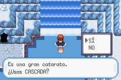 Surfea y entra en la cueva, si das un paso sobre el hielo éste se quebrará y si das sobre el hielo quebrado éste se romperá y te caerás. Avanza por el lado derecho pasando sobre el hielo y toma la Ultraball, verás que debes avanzar sobre el hielo y que tienes dos caminos para elegir, déjate caer por alguno de los dos hielos de arriba, baja y toma el Antiderretir/Nevermeltice. Sube la escalera y volverás a donde estabas, déjate caer por el hielo que está más arriba de todos y sube la escalera justo enfrente de ti, ahora déjate caer en el hielo de abajo, ahora ve: arriba, derecha, abajo, izquierda y abajo para salir del hielo, toma el Restaurar Todo a la izquierda de la escalera y súbela para que puedas tomar la MO07 Cascada/Waterfall.