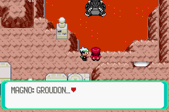 Magno/Maxie usara la Esfera/Orb robado de Monte Pírico/Pyre para despertar a un Poderoso Pokémon mítico que le ayudara a extender las tierras emergidas y aumentar el terreno para los humanos y así cumplir con sus sueños, o al menos eso piensa él. Por que logra despertar a Groudon, pero falla al no poder controlarlo. Groudon escapa y no sabemos a donde se fue y te enfrentará.