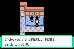 En Emerald hay otro Move Tutor, esta en el agua baja al sur de la isla y te enseñara Dynamic Punch. Si ya curioseaste con todo ve al Gimnasio. El GYM tiene un gran Puzzle de flechas que te conducen cuando las pisas. Encontraras Entrenadores con Pokémon Tipo Psíquico. Este GYM tiene 2 lideres, las hermanas Vito y Leti/Tate y Liza. Ellas pelearan contigo a la vez en una pelea 2 vs 2. Tienen un Solrock y un Lunatone en nivel 42. Con Pokémon de Agua o Dark no deben dar trabajo.