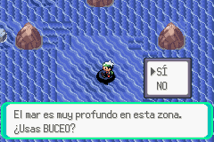 Esta es la ruta 132. Llegarás a una islita y un Black Belt (Entrenador con traje de Karateka); luego surfea de nuevo por la derecha, y llegarás a un islote de suelo acuático con más agua en el centro; ahí puedes hallar a Horsea. Ahora, vete a la esquina de más abajo a la derecha, y surfea de nuevo; pasarás por un pequeño corredor, que te llevará a una zona muerta con dos nadadoras; ve de nuevo a la derecha, para llegar a más rocas; de ahí, ve de nuevo por la derecha a surfear, para entrar a un pequeño islote de agua. Desde un punto más o menos en la izquierda del islote debes surfear al oeste para llegar a una zona donde puedes bucear, usa Buceo/Dive y vete todo, todo al sur, hasta que veas una pequeña zona con puntitos; enfrente de ellos, sube a la superficie; estarás en Cámara Sellada/Sealed Chamber: