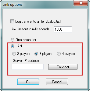 5. Abre nuevamente el emulador y espera tres segundos. Luego ve a Options > Link, asigna la cantidad de jugadores y coloca la IP en la opción «Server IP addres», luego presiona «Connect».